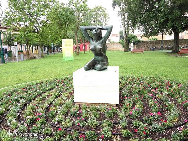 一走出水上巴士就看到一片翠綠,寬廣的公園內有Souaci Gesù雕像 , 這是誕生於此島的雕刻家雷米吉歐·巴巴洛(Remigio Barbaro)的作品,主題是願你平安(La Tua Pace),女人表情哀痛,蜷伏於地上、雙手抱頭,深切表達出男人出海捕魚時,女人在家焦急等待的心情。不過此時天空還下著雨,許先生看到這雕像居然說:這是在哀號~天啊!雨怎麼下的這麼大!!!